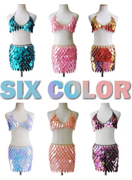 Two Piece Set Metal Chain Crop Top & Bottom - Glisten Rhombic Sequins Sexy Mini Skirt Summer Rave Festival Outfits (More colours!)