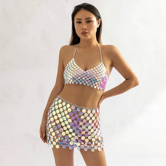 Two Piece Set Metal Chain Crop Top & Bottom - Glisten Rhombic Sequins Sexy Mini Skirt Summer Rave Festival Outfits (More colours!)