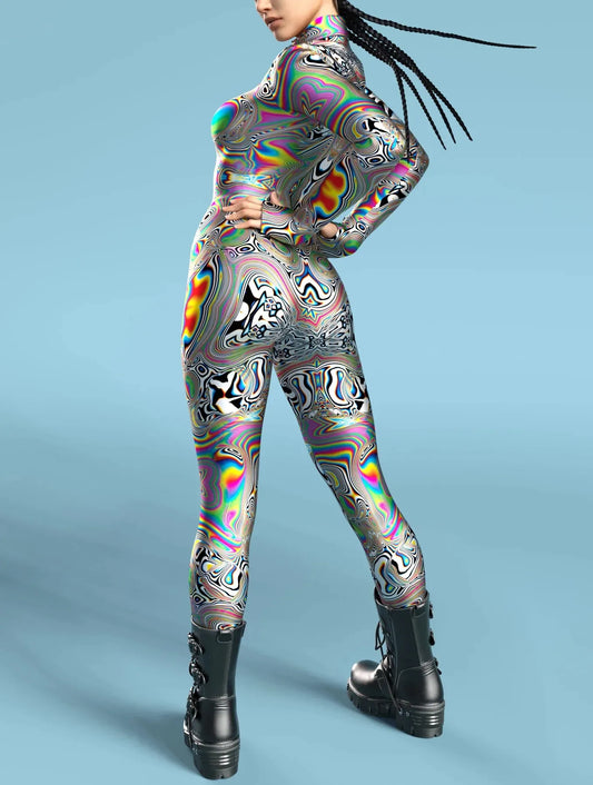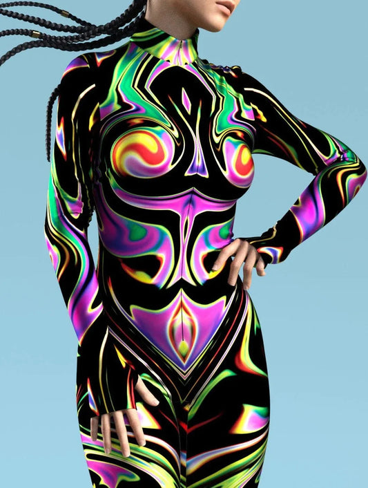 Opalescent Oil Spill Hypnotic Bodysuit - Skinny Jumpsuit Wear Onesie Doof Costume Elastic Bodysuits Rave Rompers