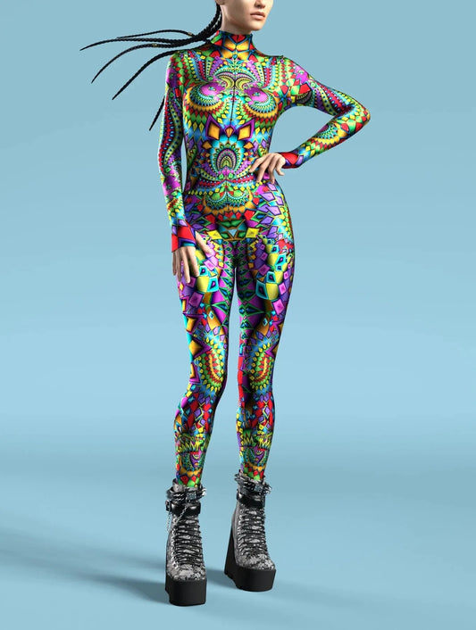 Rainbow Fractal Hypnotic Bodysuit - Skinny Jumpsuit Wear Onesie Doof Costume Elastic Bodysuits Rave Rompers