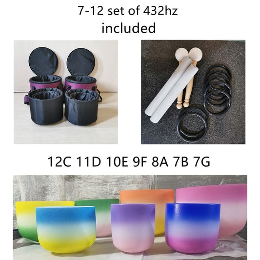 7pcs Frosted Gradient Quartz Crystal Singing Bowl Chakra Set w/ Carrying Case - 6-12 Inch CDEFGAB